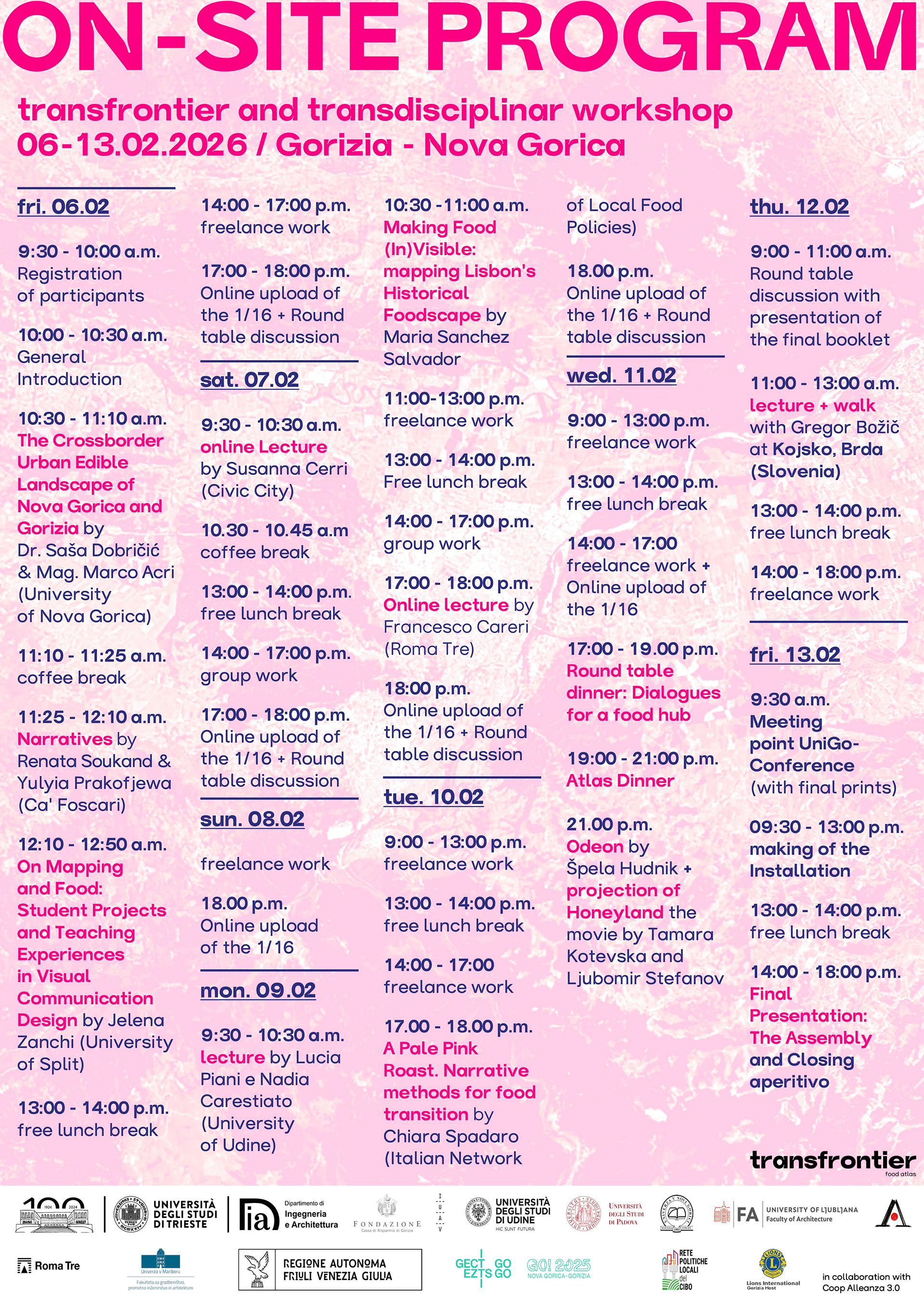 Over two weeks (31st January 2026 –online– and 06–13 February 2026), the “Assembling the Transfrontier Food Atlas” workshop invites students, researchers, practitioners and local activists to take part in the making of the Transfrontier Atlas – the cross-border food atlas of the Gorizia–Nova Gorica area. Participants will work directly in the field and across multiple borders, contributing to a shared tool for understanding this territory through food.